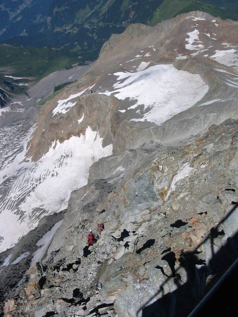 Z ochozu kolem chaty jsme si mohli pěkně prohlédnout to, co jsme za dva dny ušli - vlevo v rohu cestu z tramvaje k šedivému ledovci u chaty Tête Rousse, kuloár, podél něj vybíhající žebro a poslední lezecky asi nejobtížnější úsek cesty "ozdobený" ocelovými lany.