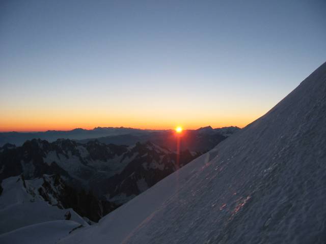 Stále jsme stoupali po úzkém hřebeni. Najednou jsme uviděli špičku Mont Blancu jenom pár desítek metrů nad námi. Začínali jsme si být neochvějně jistí úspěchem a naši euforii umocnil kýč kýčů, východ slunce.